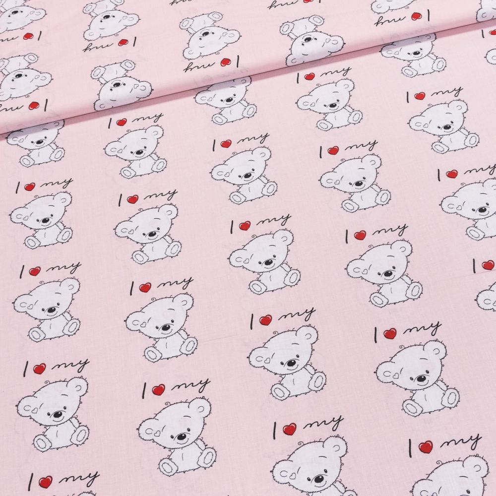 Bavlněná látka (tkanina) se vzorem roztomilých medvídků s červenými srdíčky a nápisy na světle růžovém pozadí. Látka je v šířce 140 cm, vyrobena ze 100% bavlny (gramáž 135g/m2) v plátnové vazbě. Vzor látky je natištěn jen z jedné strany z druhé strany je látka bez potisku.