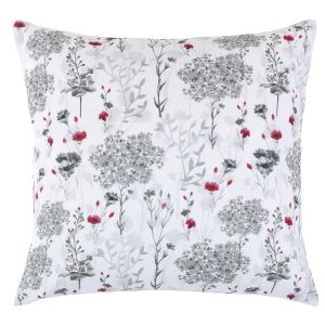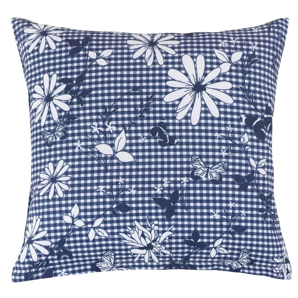 Dekorační polštářek s motivem bílého květu na modré kostičce. Polštářek je z obou stran stejný. Povlak na polštářek je vyroben z 90% bavlny a 10% polyesteru a výplň je tvořena ze 100% Polyesteru (kuličky z dutého vlákna). Vnitřní výplň je možné vyjmout a prát povlak samostatně.