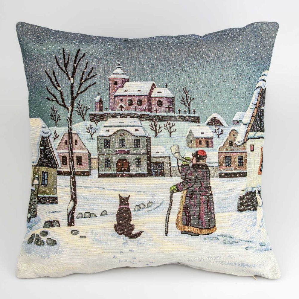 Dekorační povlak na polštářek v retro provedení z hustě tkané látky (gobelín) s vysokou gramáží s ladovským vzorem ponocného se psem v šedo-modrém provedení v rozměru 45 x 45 cm. Vzor na povlaku je oboustranný. Povlak na polštářek je vyroben ze 70% polyesteru a 30% bavlny. Zapínání na ZIP. Povlak je možné objednat samostatně bez výplně, s levnější dekorační výplní nebo luxusnější výplní na spaní.