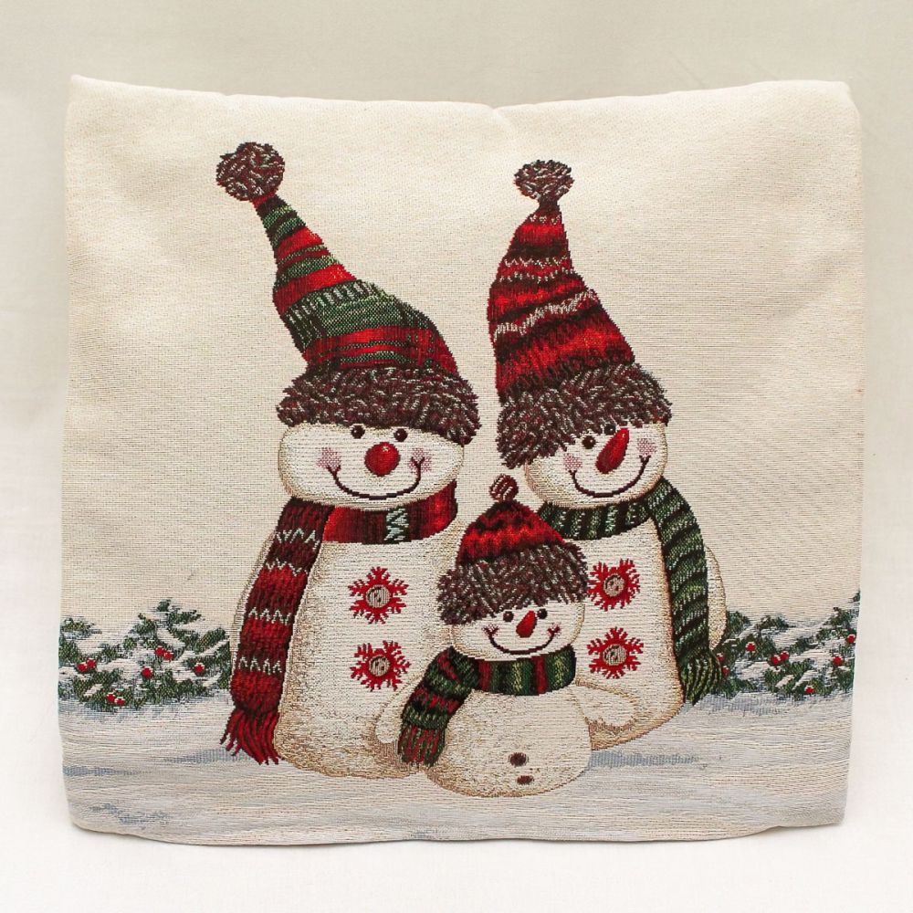 Dekorační povlak na polštářek v retro provedení z hustě tkané látky (gobelín) s vysokou gramáží se vzorem sněhuláků v čepicích a šálách na smetanovém podkladu v rozměru 45 x 45 cm. Vzor na povlaku je oboustranný. Povlak na polštářek je vyroben ze 70% polyesteru a 30% bavlny. Zapínání na ZIP. Povlak je možné objednat samostatně bez výplně, s levnější dekorační výplní nebo luxusnější výplní na spaní.