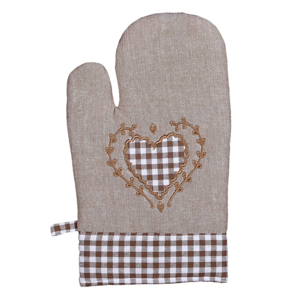 Kuchyňská chňapka (rukavice) s kuchyňským jednostranným vzorem hnědého kára a srdce uprostřed. Chňapka má všitý magnet a poutko na zavěšení. Chňapka je v rozměru 28x18cm a je vyrobena ze 100% bavlny s výplní ze 100% polyesteru (rouno z dutého vlákna).