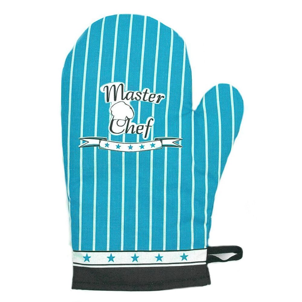 Kuchyňská chňapka (rukavice) s kuchařským oboustranným vzorem s nápisem Master Chef a proužky v modrém provedení. Chňapka má všitý magnet a poutko na zavěšení. Chňapka je v rozměru 28x18cm a je vyrobena ze 100% bavlny s výplní ze 100% polyesteru (rouno z dutého vlákna).