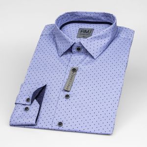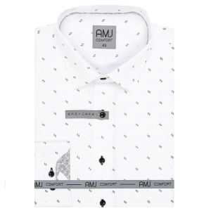 Pánská vzorovaná košile AMJ Comfort s dlouhým rukávem. Pánská košile je v tmavě modré barvě se vzorem drobných bílých vlnek se světle modrými doplňky. Košile se hodí jak do zaměstnání, tak na běžné nošení i do společnosti. V této košili Vám bude velmi příjemně díky použití kvalitního materiálu (95% bavlna, 5% spandex).