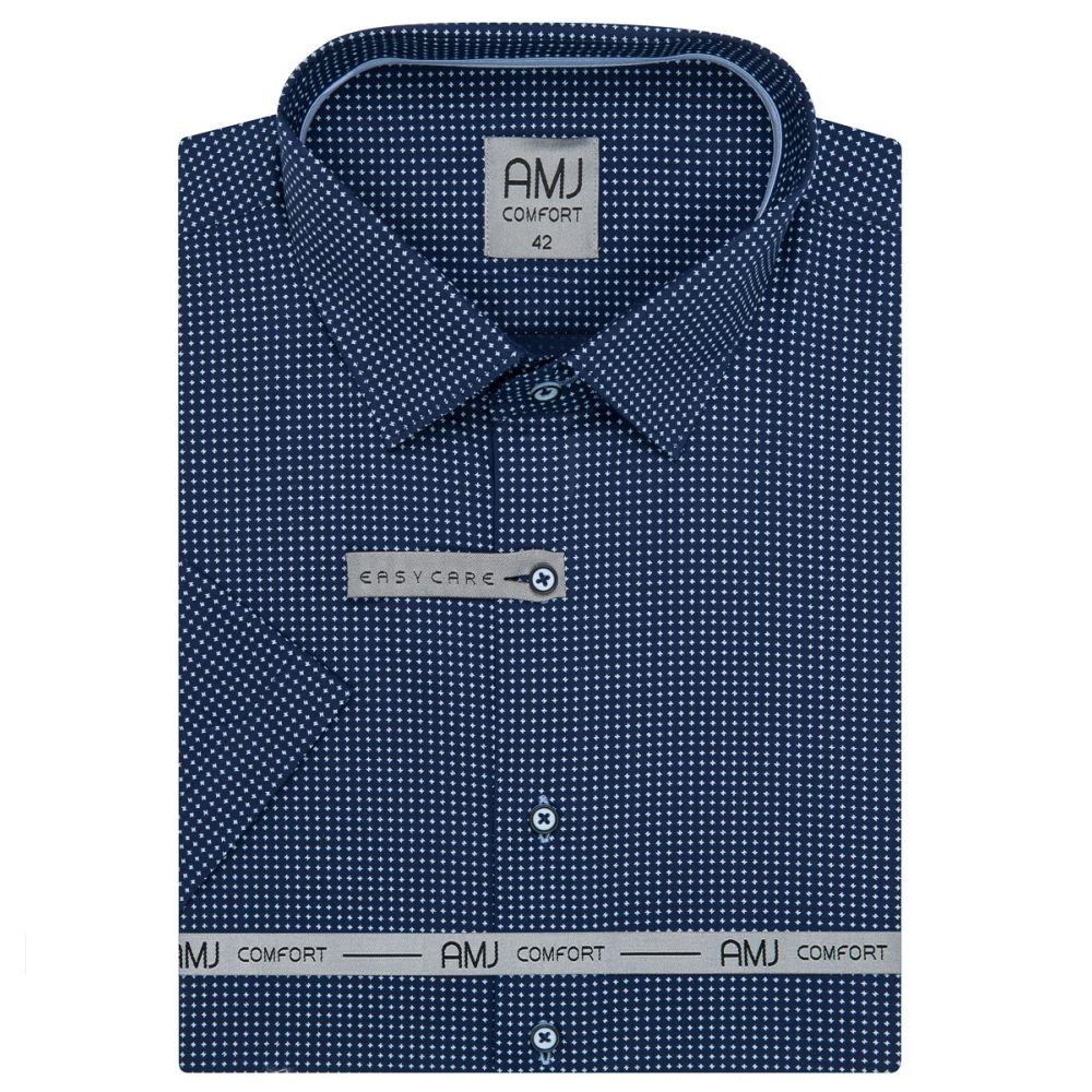 Pánská vzorovaná košile AMJ Comfort s krátkým rukávem. Pánská košile je v tmavě modré barvě se vzorem drobných kostiček tvořených čárkami se světle modrými doplňky. Košile se hodí jak do zaměstnání, tak na běžné nošení i do společnosti. V této košili Vám bude velmi příjemně díky použití kvalitního materiálu (95% bavlny 5% spandex).