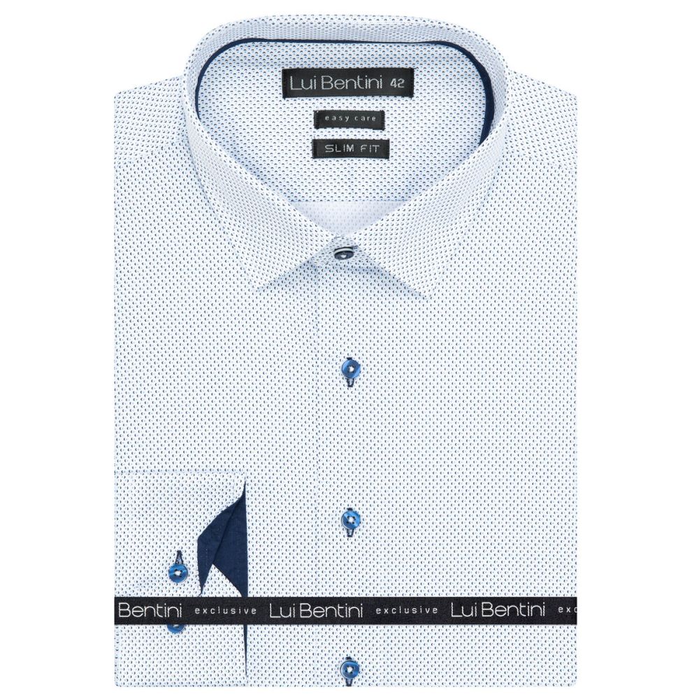 Luxusní pánská košile Lui Bentini s dlouhým rukávem v projmutém střihu, tzv. slim fit (je vypasovaná, tedy zúžená v pase). Košile Lui Bentini mají velmi elegantní střih a jsou proto vhodné do zaměstnání, na běžné nošení, ale i ke společenským událostem.
