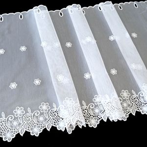Metrážová tylová vitrážová záclona se vzorem vyšívaných obloučků na bílé zakončená hustšími obloučky, ve vrchní části s oky na zavěšení na tyč. Záclona je vyrobena ze 100% polyesteru a je dostupná v různých výškách. Výška záclony je měřena v nejdelším místě. Šířku záclony zadejte do kolonky "Množství"