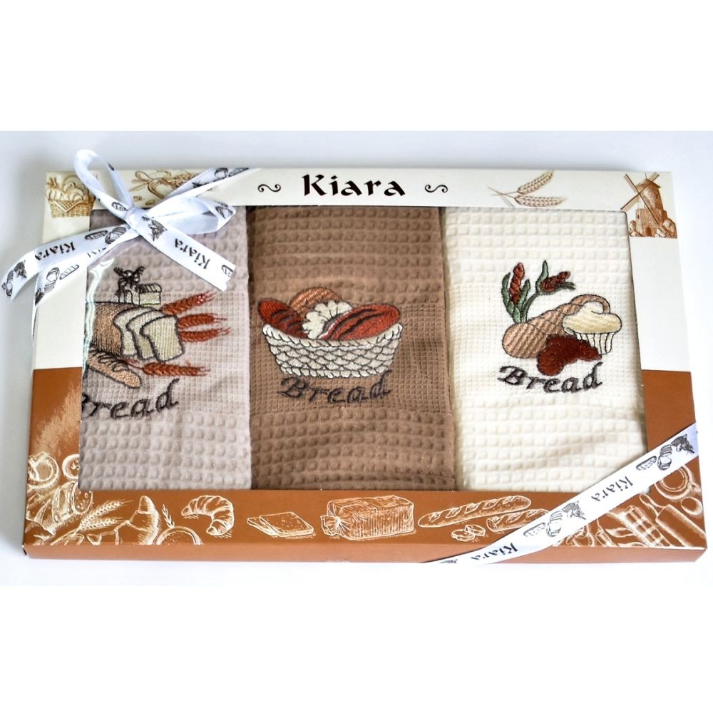 Bavlněné vaflové utěrky s motivem pečiva na béžových a krémových podkladech podkladu. Balení obsahuje 3 kusy utěrek v rozměru 50x70cm. Utěrky jsou baleny v ozdobné dárkové krabičce a jsou vyrobeny ze 100% bavlny.